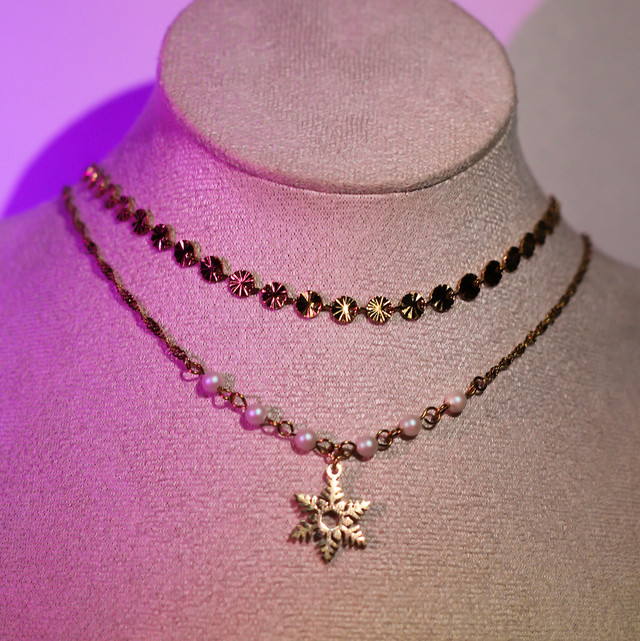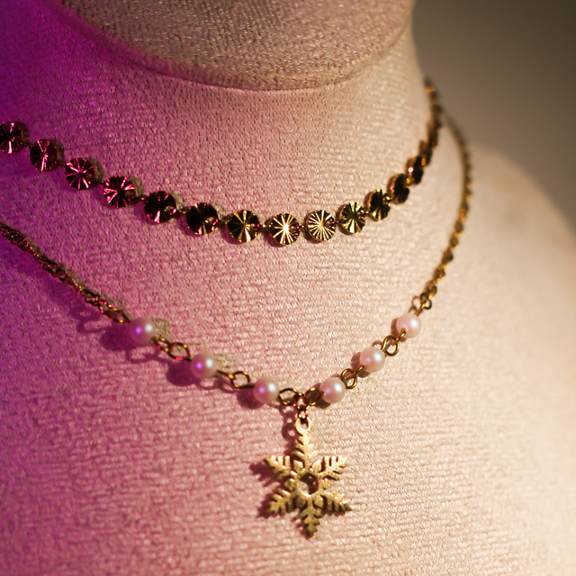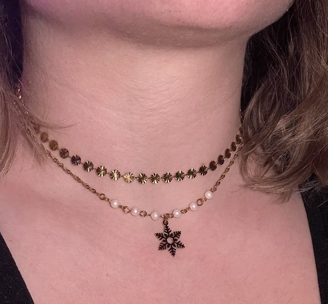 ☃️ Disponible en doré ou argenté, ce collier à double chaîne capture la magie de l’hiver. Les chaînes sont ornées de petits détails ronds, rappelant les boules de neige scintillantes, et sont parées de perles blanches nacrées et givrés, évoquant la pureté des paysages enneigés. Un flocon délicat trône au centre, apportant une touche féerique et lumineuse.☃️
